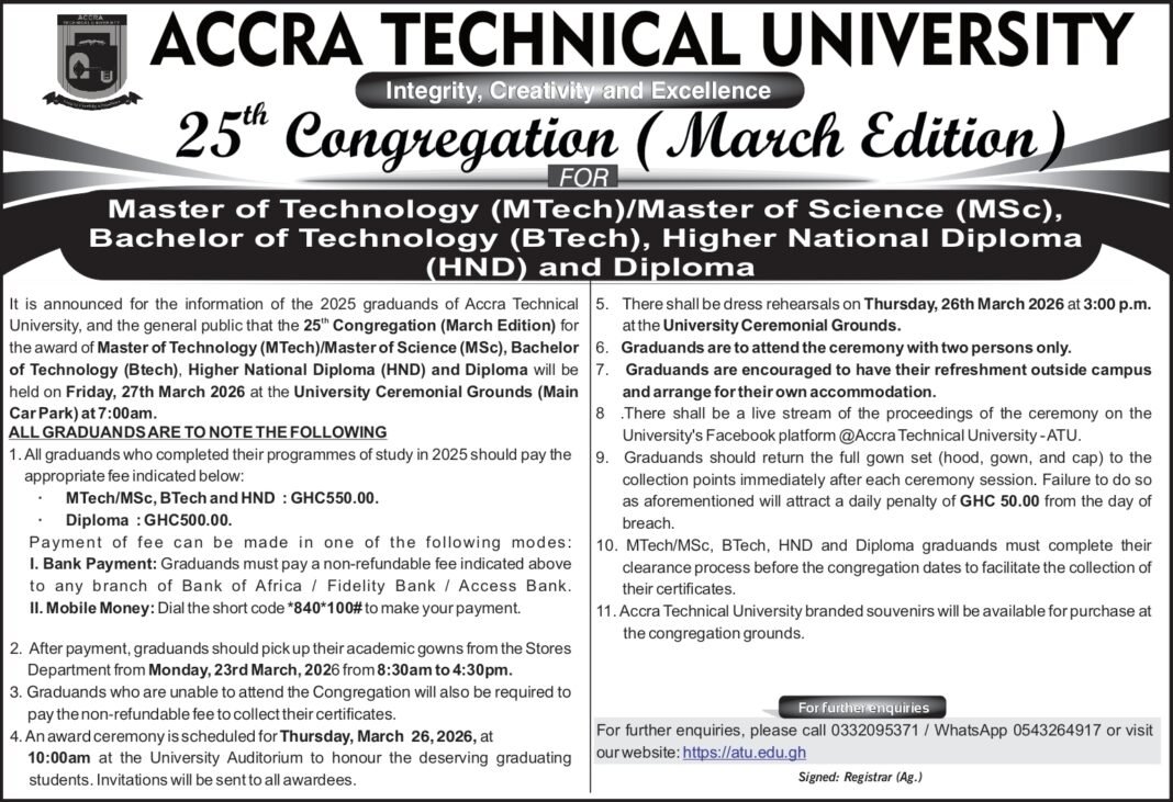 Accra Technical University (ATU) has officially announced its 25th Congregation (March Edition) for the conferment of academic degrees and diplomas to graduates who completed their programmes in 2025. The ceremony will recognize students who have successfully completed programmes leading to the Master of Technology (MTech), Master of Science (MSc), Bachelor of Technology (BTech), Higher National Diploma (HND), and Diploma awards.
