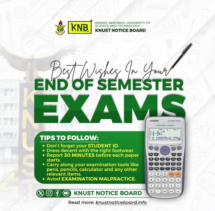 In closing, the KNUST NOTICE BOARD wishes all students the very best in their end of semester examinations. May their hard work and dedication yield positive results, and may they emerge from this challenging period with renewed confidence and a deeper understanding of their chosen fields of study. The board looks forward to celebrating the students’ successes and achievements in the days to come.