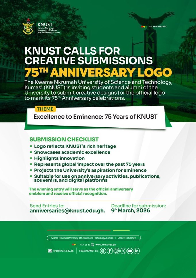 The Kwame Nkrumah University of Science and Technology (KNUST) has officially announced a call for creative submissions for its 75th Anniversary logo, inviting students and alumni to contribute to a historic milestone in the University’s journey.