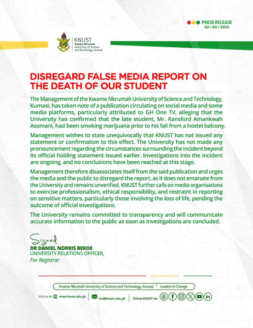 In a press release dated February 10, 2026, the University said it has taken notice of publications circulating on social media and some media platforms, particularly reports attributed to GH One TV, which alleged that KNUST had confirmed the student was smoking marijuana before falling from a hostel balcony.