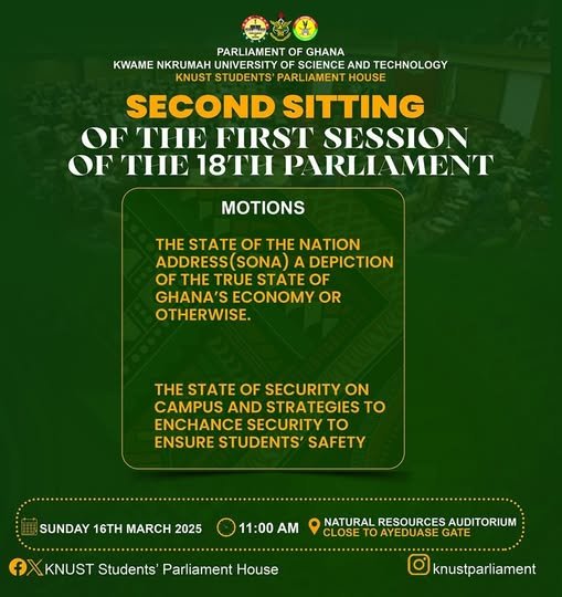 The Kwame Nkrumah University of Science and Technology (KNUST) Students’ Parliament House (KSPH) has announced the second sitting of the first session of the 18th Parliament.