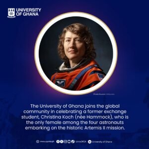 The University of Ghana has proudly joined the international community in recognizing its former exchange student, Christina Koch (née Hammock), following her remarkable participation in the historic Artemis II mission, a major step in humanity’s renewed exploration of deep space.